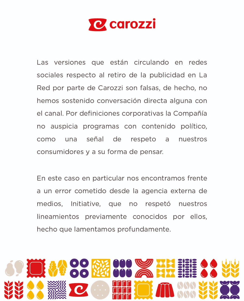 El rumor se instaló anoche pero no fue hasta las 1330 de hoy que el canal La Red confirmó a través de sus redes sociales que la empresa Carozzi decidió quitar todos los auspicios de la señal privada tras la emisión del documental La. El canal La Red denunció públicamente este domingo que la conocida empresa multinacional Carozzi retiró su publicidad en señal de represalia.